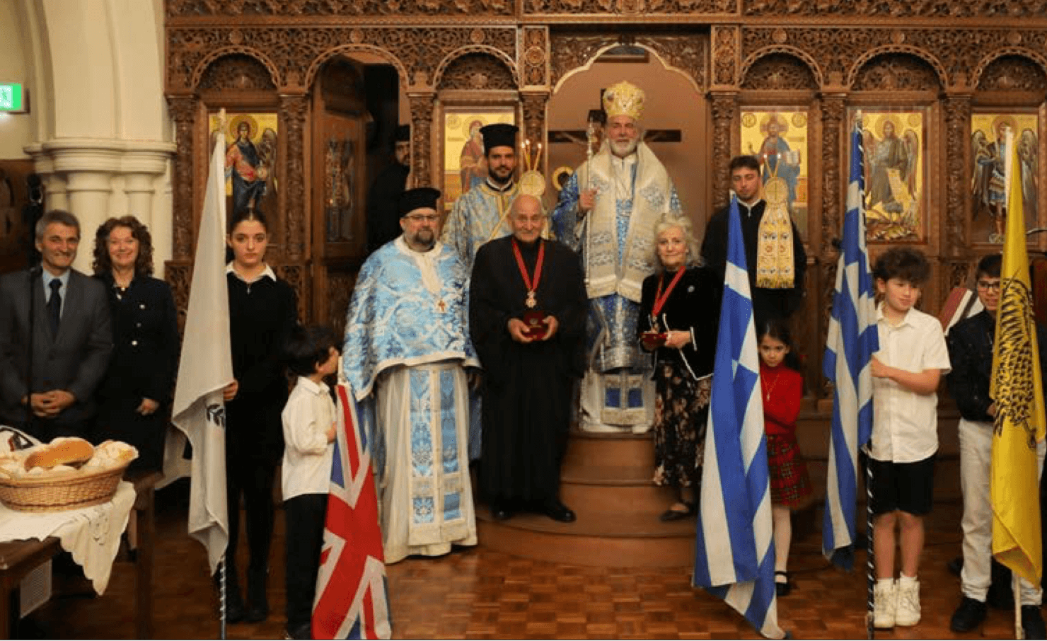 Ο Σεβασμιώτατος απένειμε τον Σταυρόν της Αρχιεπισκοπής Θυατείρων και Μεγάλης Βρεταννίας εις την κα Νίκη Μπήλς και τον κ. Νικόλαον Ευθυμίου διά την μακροχρόνιον προσφοράν των εις την κοινότητα. Η κα Μπήλς, μετά του μακαριστού συζύγου της Ιωάννου, υπηρετεί την κοινότητα εξ αρχής της ιδρύσεώς της, μετά την μετοίκησίν της εκ Κωνσταντινουπόλεως όπου ειργάζετο διά την βελτίωσιν της καταστάσεως των Ορθοδόξων Χριστιανών και Ελλήνων της περιοχής. Ο δε κ. Ευθυμίου προσέφερε ακαμάτως τας υπηρεσίας του ως ιεροψάλτης, νεωκόρος και επιμελητής του ναού, διαθέτων και προϊόντα εκ του ιδίου προς ενίσχυσιν της εκκλησίας εις περιόδους ανάγκης. Ο Σεβασμιώτατος εξέφρασεν επίσης τας ευχαριστίας του προς τον Ταμίαν της Κοινότητος κ. Χρήστον Τζάλλαν διά την γενναιόδωρον προσφοράν του εις την ενορίαν.